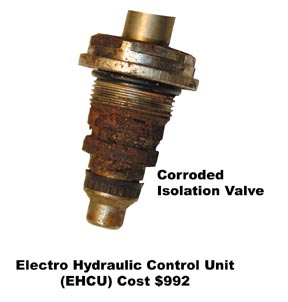 If you wait until your brake fluid fails a moisture test, it may already be too late! After brake fluid corrosion inhibitors are severely depleted, corrosion of the internal components begin. Corrosion can pit the metal bores of the master cylinder, slave cylinders and ABS components. This means that pistons cannot move freely, seals can be damaged and cylinders can develop internal or external leaks. A thorough brake fluid flush-and-fill is cheap insurance.